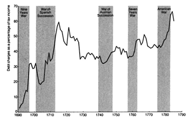 But, of course, almost all of these debts were accumulated as costs of war. From John Brewer, The Sinews of Power: War, Money, and the English State, 1688-1783, pg 94 :